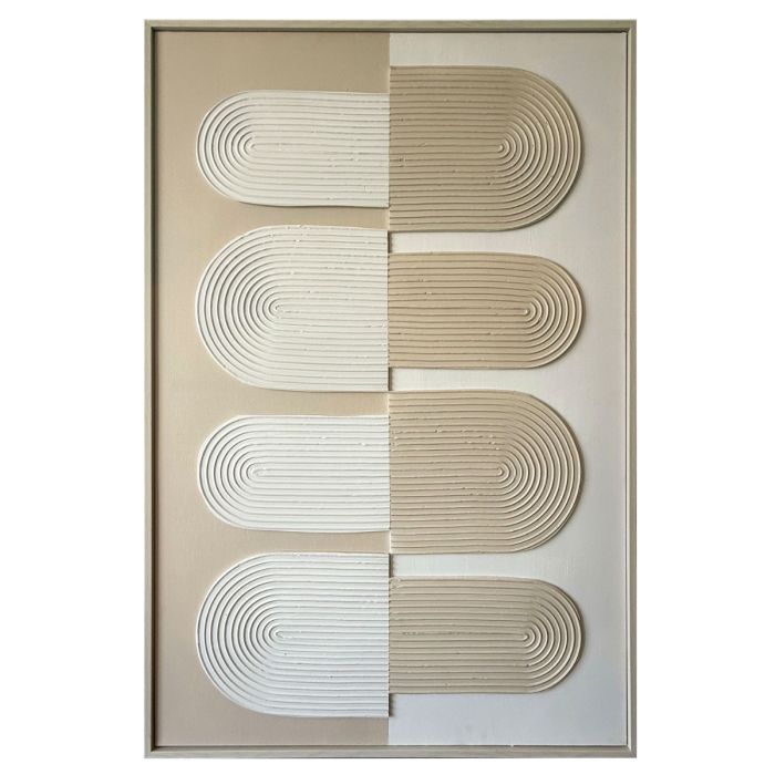 3D canvas on an MDF frame, dimensions 80x120x3 cm, executed in white and beige shades with a minimalist and timeless geometric relief. Perfectly suitable for shop windows, presentations and hospitality environments such as dinner or buffet setups, where the calm color palette and texture enhance visual merchandising. The high-relief structure combined with the MDF frame provides a distinctive and elegant accent that aligns with modern interior trends. Order your stock from Cinar Trading Europe B.V. and convince your customers with this high-quality wall decoration.